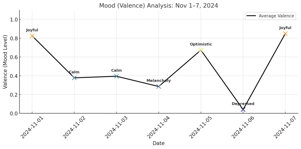 It then visualizes your mood across hours, days, or months using clear, color-coded graphs.